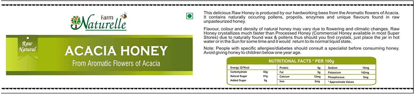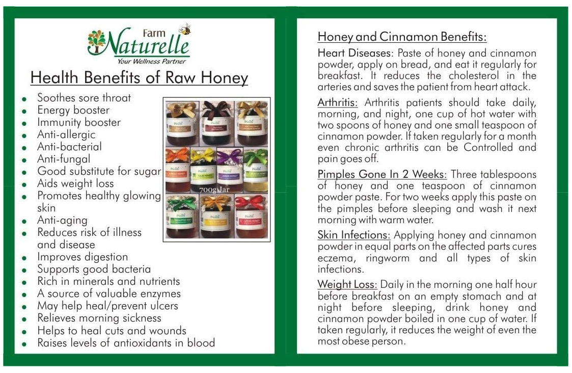 Farm naturelle Raw honey contains all naturally occurring vitamins A, B-complex, C, D, E, & K, a whole lot of minerals, amino acids and hundreds of live enzymes to give you in-numerous health benefits which no other super-food can provide.