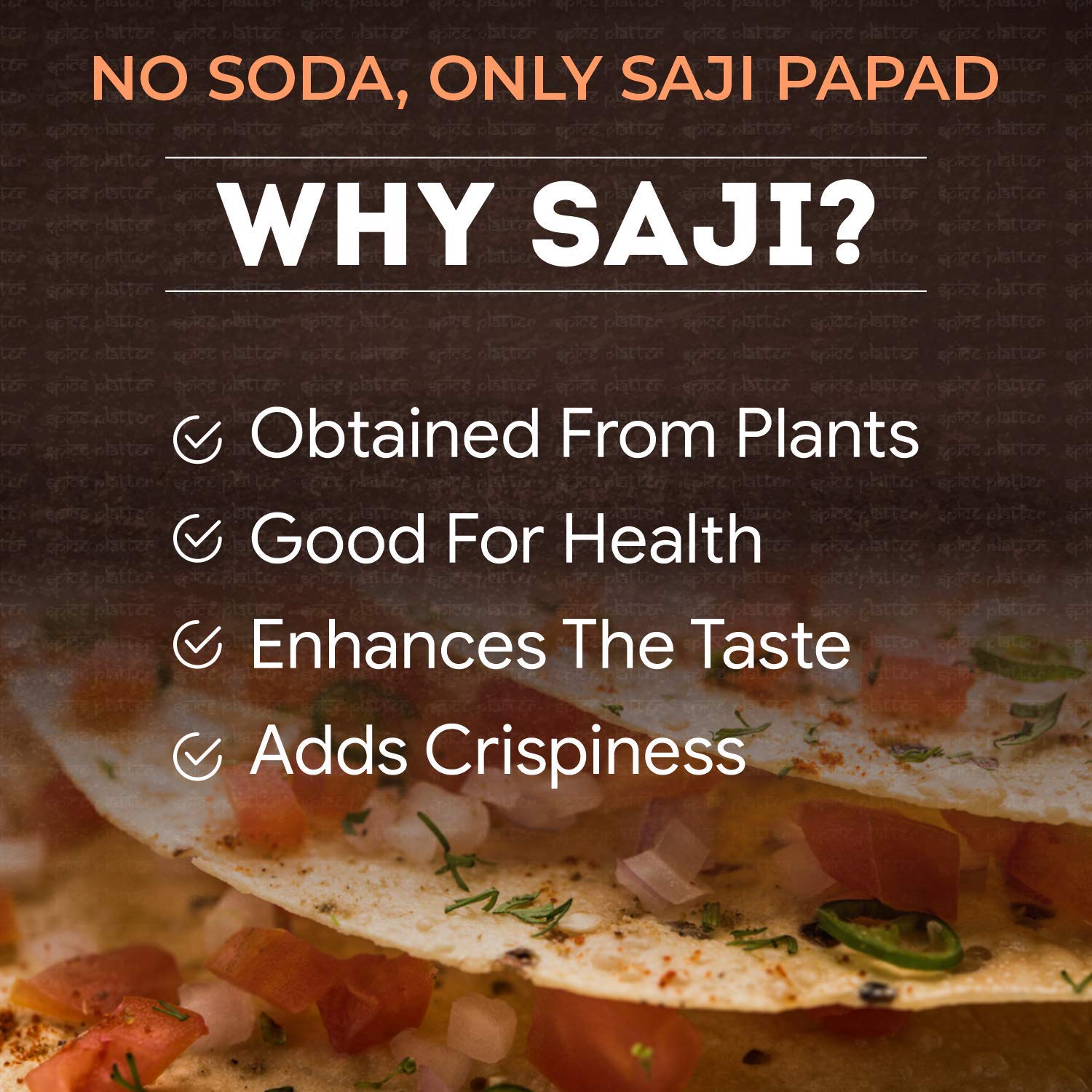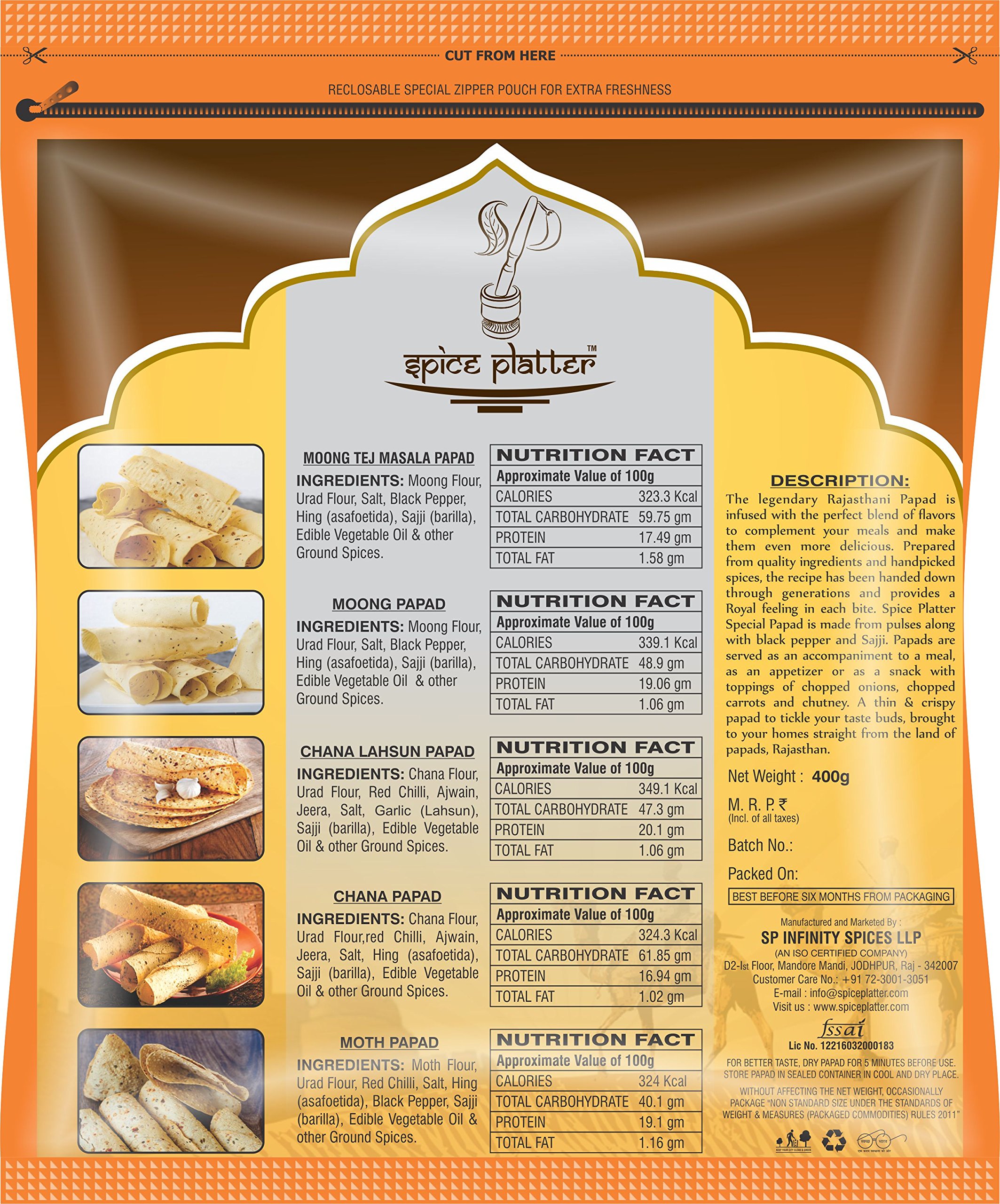 100% Natural NO preservatives No MSG: Prepared from quality ingredients and special blends of spices with a recipe that has been handed down over generations that provides a Royal feeling in every bite. Spice Platter Papad is a thin crisp disc shaped made