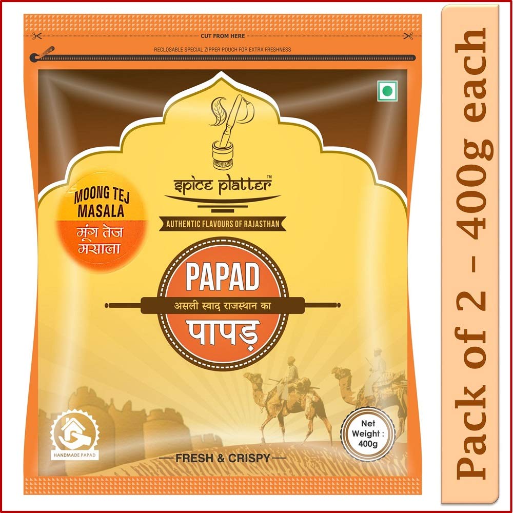 Spice Platter Moong Tej Masala Papad 800g are legendary Rajasthani papad infused with right crispness and flavour that makes every meal delicious. Pack of 2 - 400g each