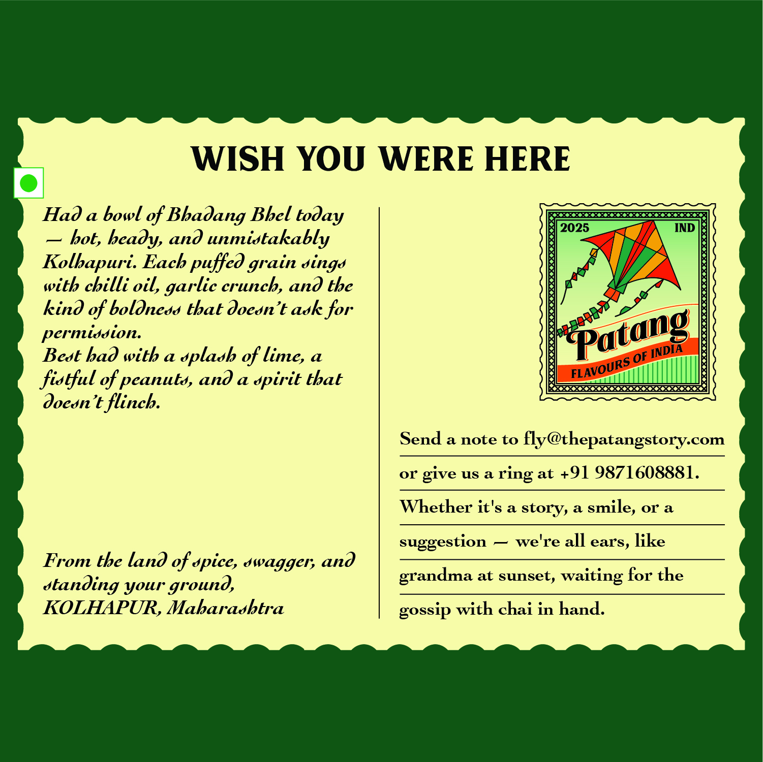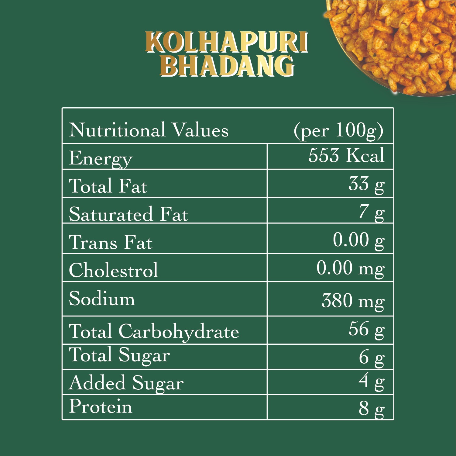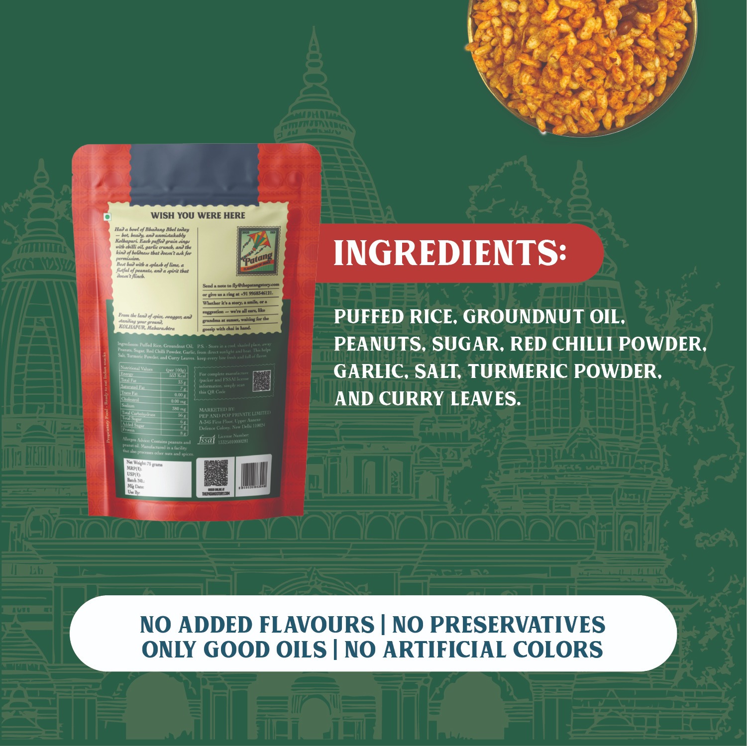 Bold Kolhapuri flavor: Fiery puffed rice snack seasoned with roasted garlic, red chilli, mustard seeds, and authentic Kolhapuri masala.