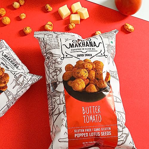Ingredients : Makhana Olive oil Sugar Spices & Condiments (Red chilli Dried Onion Flakes Coriander Seeds Fennel Black Pepper Mace) Salt Tomato Powder Maltodextrin Nausadar (Ins 150) Butter Concentrate Acidity Regulators (Ins 330) & (INS 296) Hydrolyse Pea