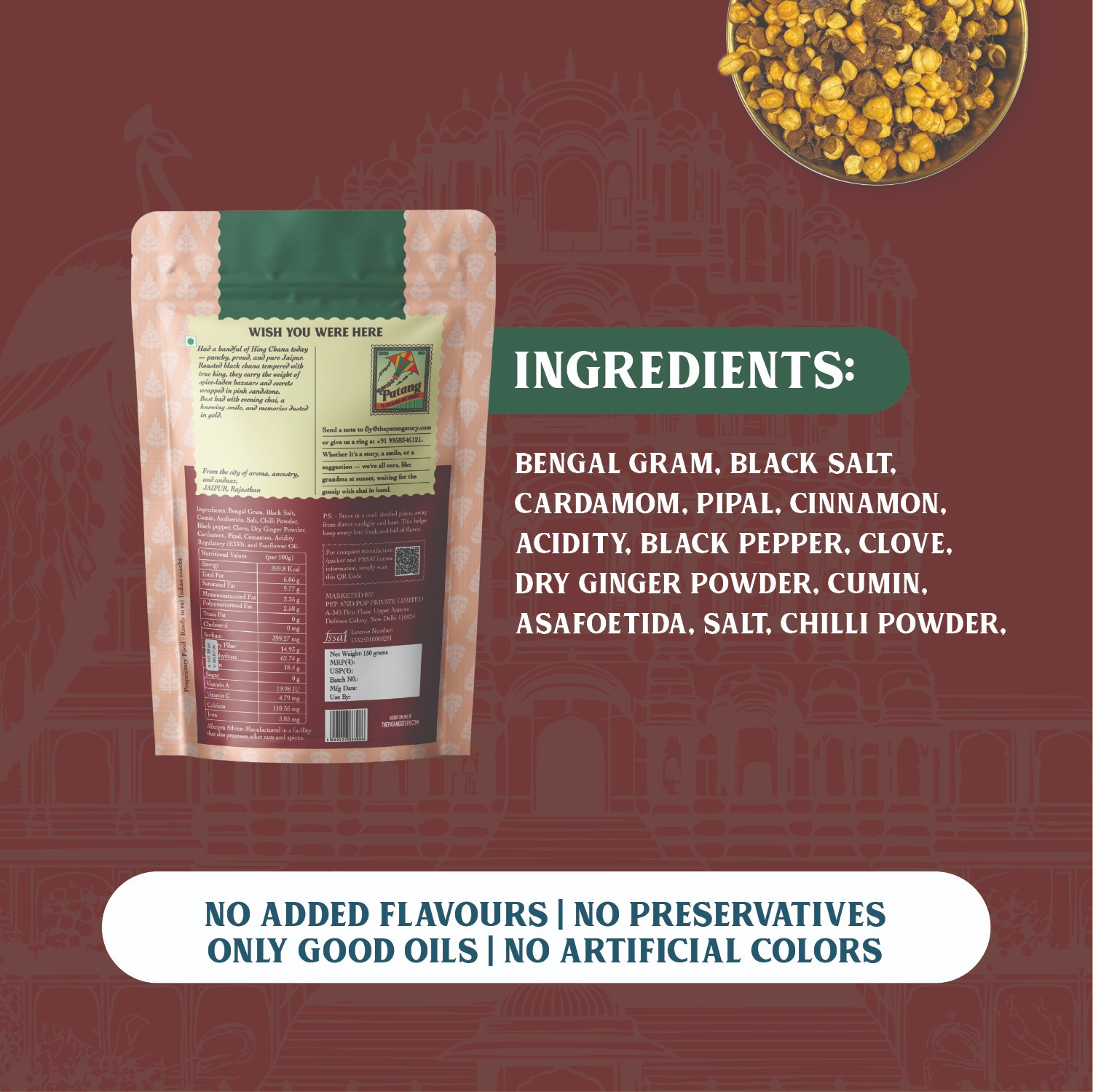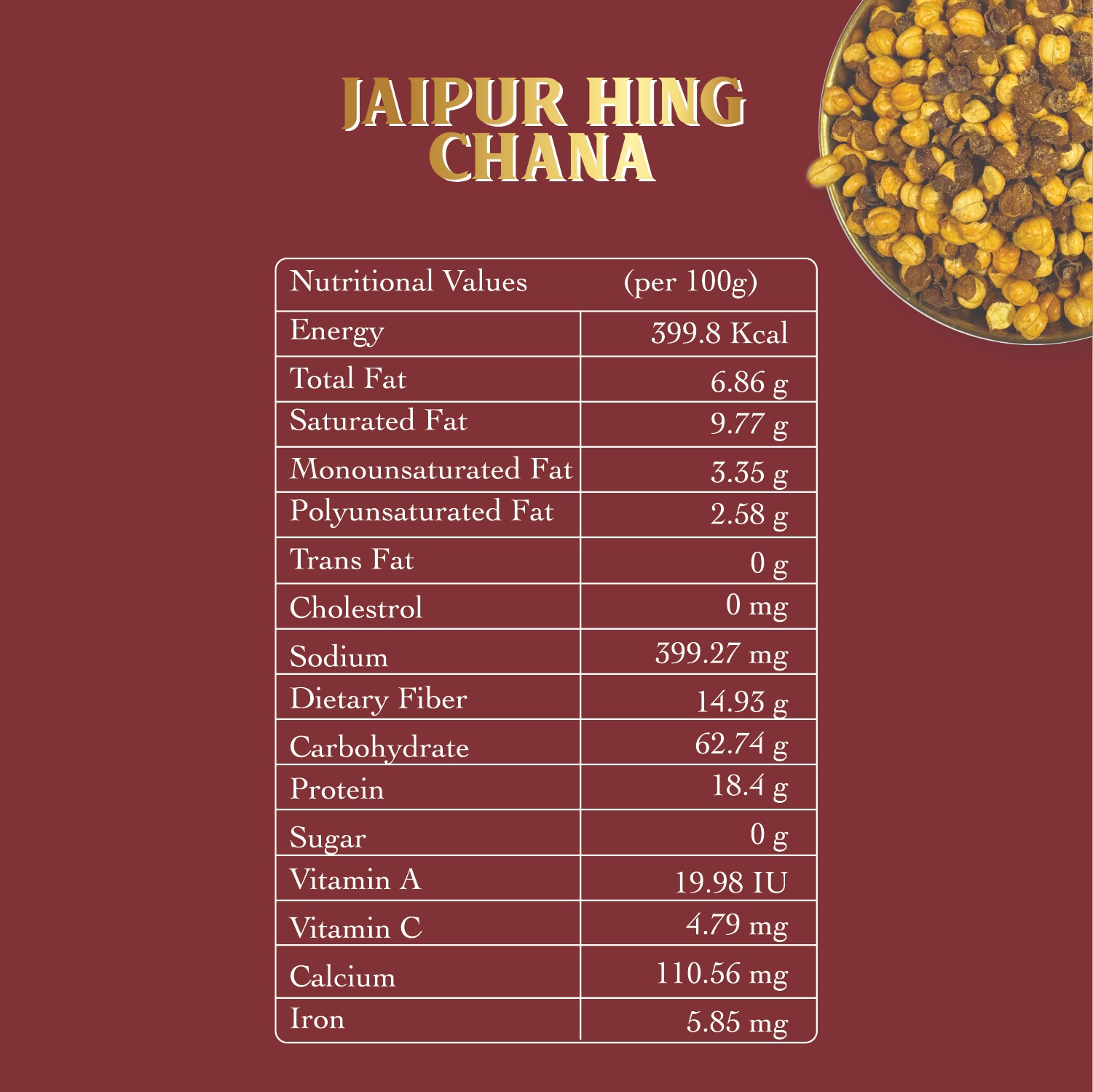 Authentic Jaipur snack: Roasted Bengal gram chickpeas seasoned with aromatic asafoetida and a blend of traditional desi masalas.