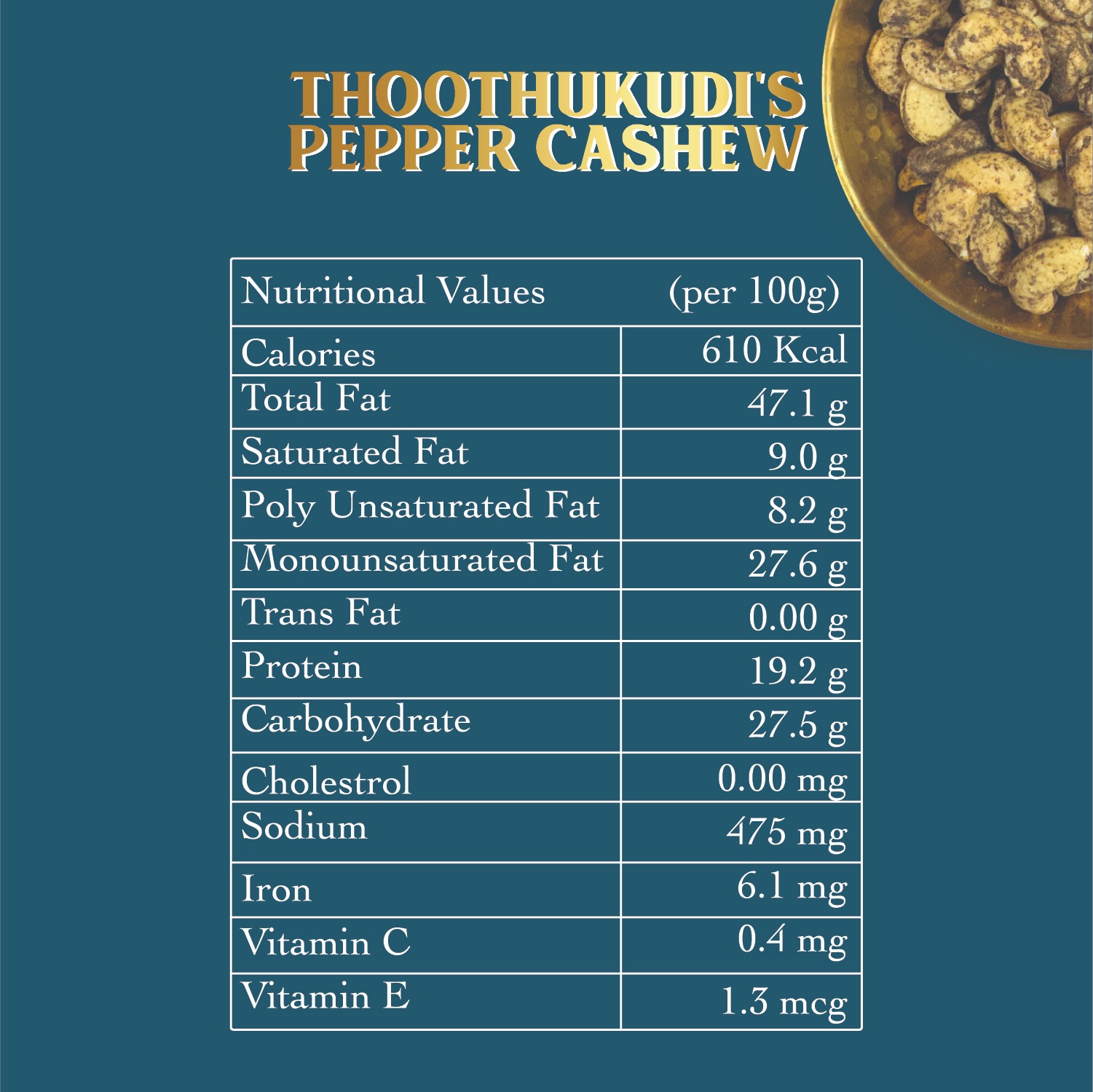 Bold, authentic flavor: Hand-roasted cashews from Thoothukudi, coated with freshly cracked black pepper for a warm, lingering bite.