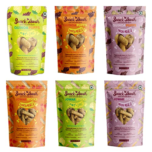 SnackAmor Tea Time Healthy Snacks Goodness Of Jowar & Quinoa Minimally Processed Jowar Sticks And Quinoa Puffs 3 Flavors Each (Pack Of 6 - 300G)