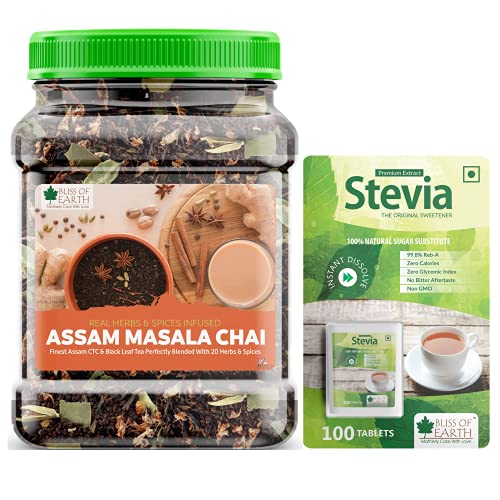 Bliss of Earth Combo Of Finest Assam Masala Chai (400gm) Blended CTC leaf infused with 20 real herbs & spices And 99.8% REB-A Purity Stevia Tablets Sugar free Pellets (100 Tablets) Pack Of 2