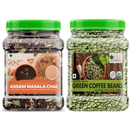 Bliss of Earth Combo Of Finest Assam Masala Chai (400gm) Blended CTC leaf infused with 20 real herbs & spices And Organic Arabica Green Coffee Beans (500gm)AA Grade