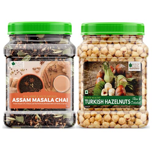 Bliss of Earth Combo Of Finest Assam Masala Chai (400gm) Blended CTC leaf infused with 20 real herbs & spices And Turkish Hazelnuts Raw & Dehulled Healthy & Tasty (500gm)