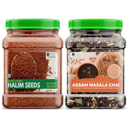 Bliss Of Earth Combo of Organic Halim Seeds (600gm) for Eating and Finest Assam Masala Chai (400gm) Blended CTC Leaf Infused with 20 Real Herbs & Spices (Pack of 2)