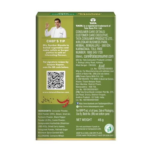Tata Sampann Sambar Masala Powder with Natural Oils, 45g, Crafted by Chef Sanjeev Kapoor, With Chef’s Exclusive Tip, Rich Aroma & Flavour