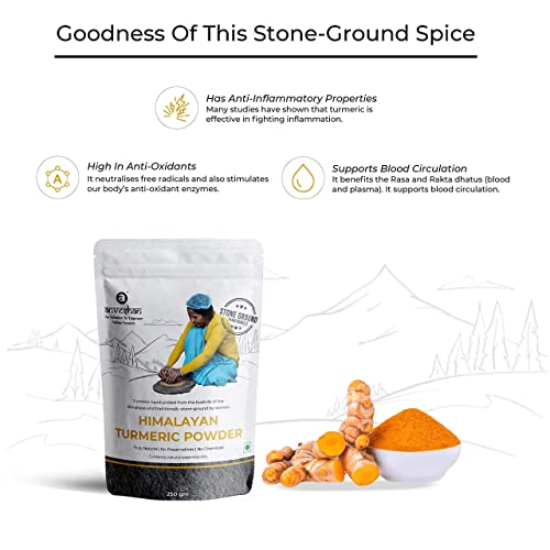 RAW & UNPROCESSED: Our Stone-Ground Turmeric Powder is 100% pure vegan preservative-free chemical-free &. The turmeric roots are ground by rural women using the traditional stone-grinding method to ensure that the nutrients remain intact. They are hand-gr