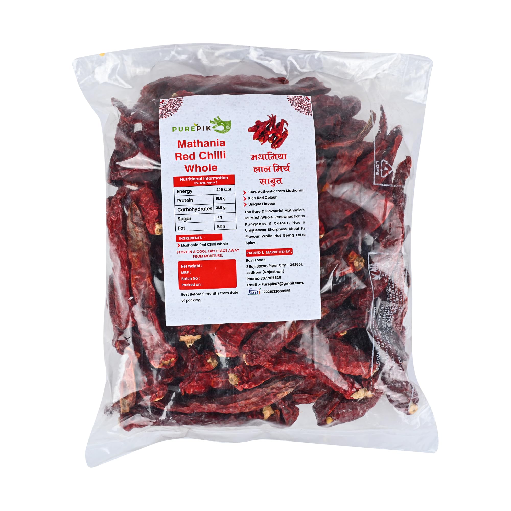 100 % Original Stemless Premium Quality Pure Pik Mathania Chillies. 200 Grams And Shelf Life:6 Months From Date of Packing.