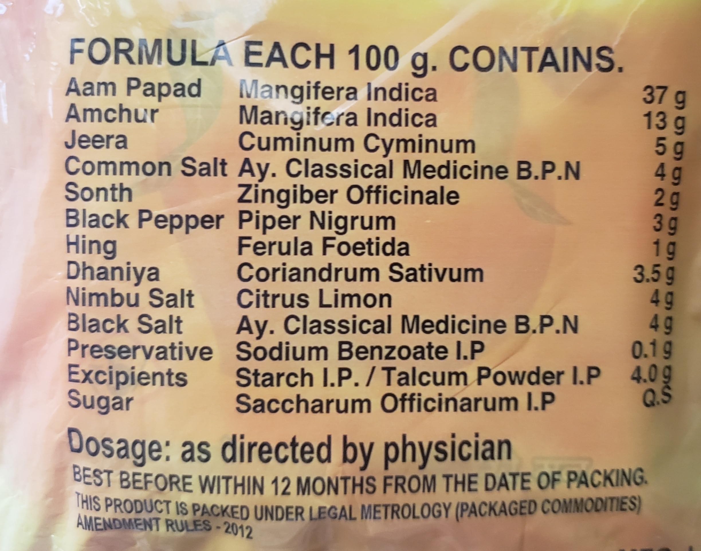 Ingredients: Mango Pulp Sugar Dry Mango Powder cumin Seeds Coriander Black Pepper Peepla Iodized Salt Black Salt