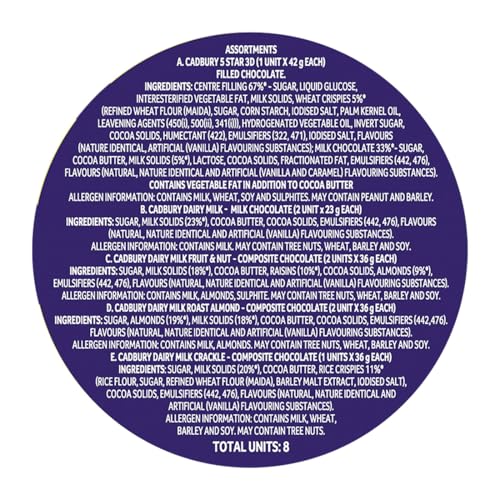 This assorted chocolates gift pack contains 1 unit of Cadbury 5-Star 3D-42g 2 units of Cadbury Dairy Milk Chocolate-23g 1 units of Cadbury Dairy Milk Crackle-36g 2 units of Cadbury Dairy Milk Fruit & Nut-36g and 2 units of Cadbury Dairy Milk Roast Almond-