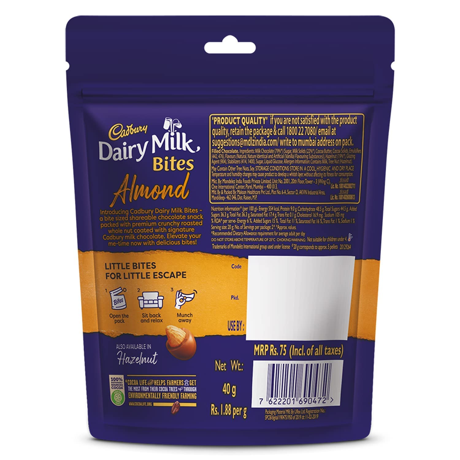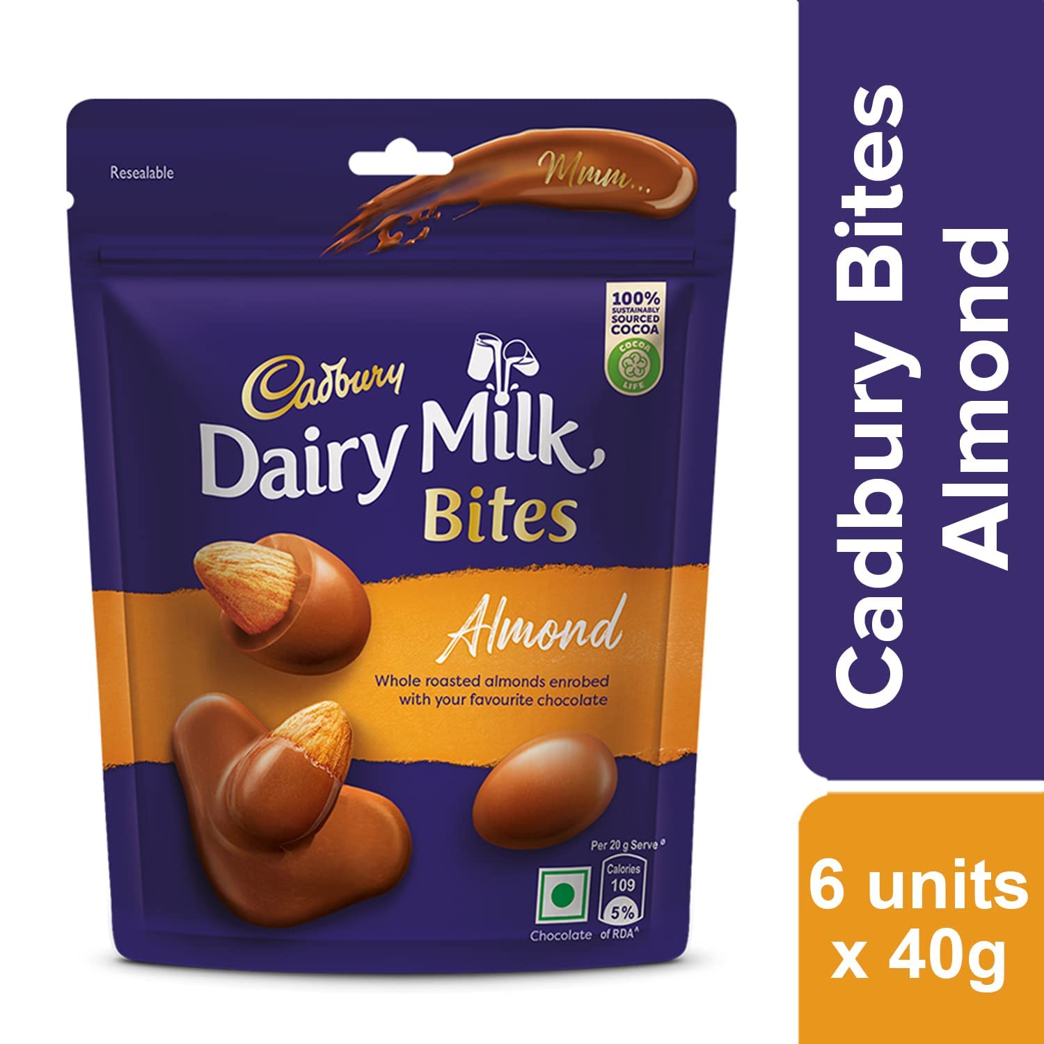 Product 1: Bite sized chocolate snack packed with premium crunchy roasted whole almond coated with signature Cadbury Dairy Milk chocolate