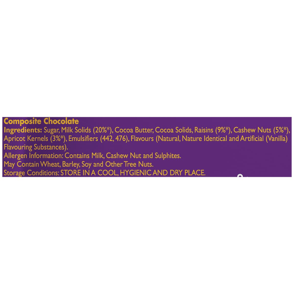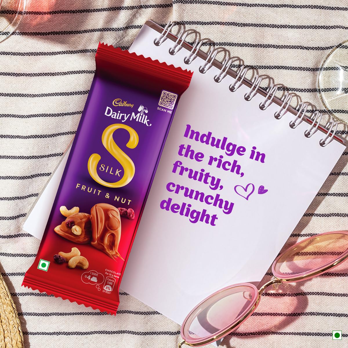 Cadbury Dairy Milk Silk Fruit and Nut is made with a glass and a half of milk and offers a delicious combination of combination of creamy milk chocolate and almonds & raisins