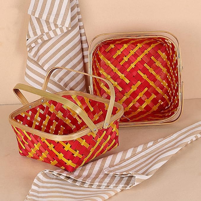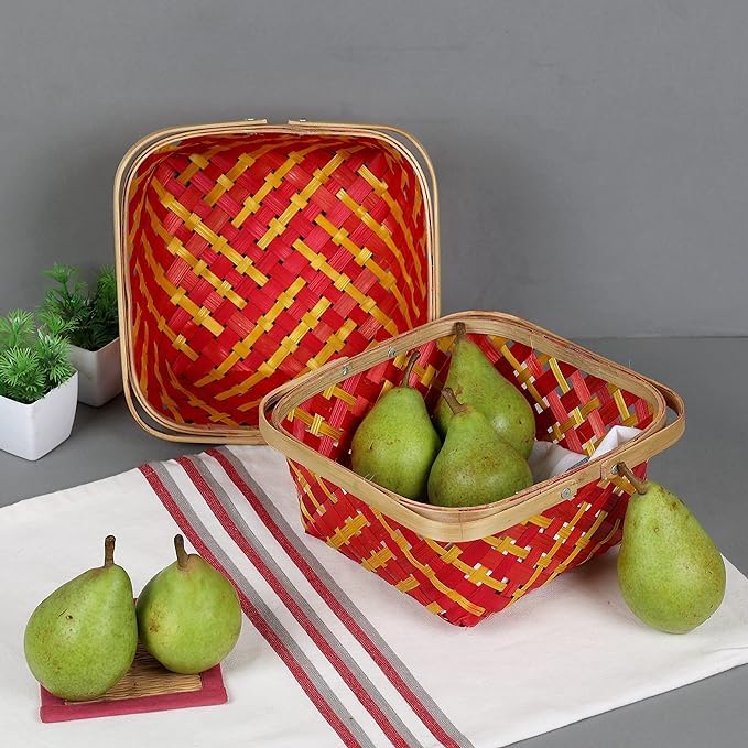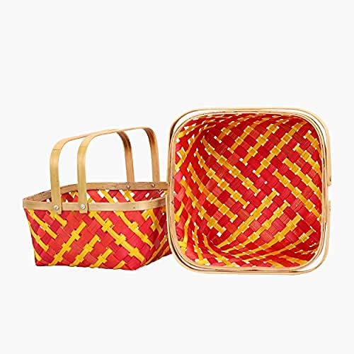 HomeGrocerySweetsChocolatesHandle cane bamboo basket for multipurpose uses natural brown wicker for hamper chocolate flower pooja cane basket. Set of 2 baskets. (Red)