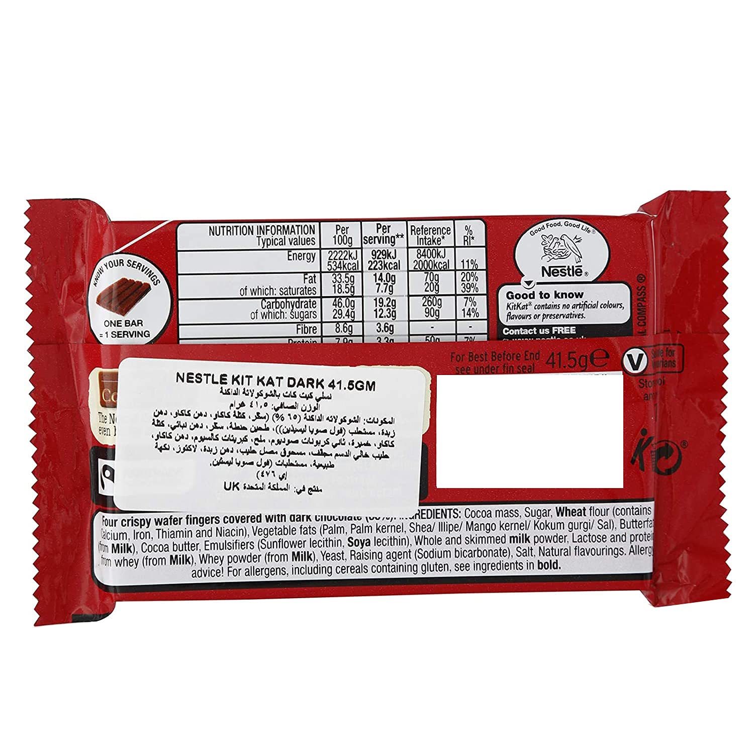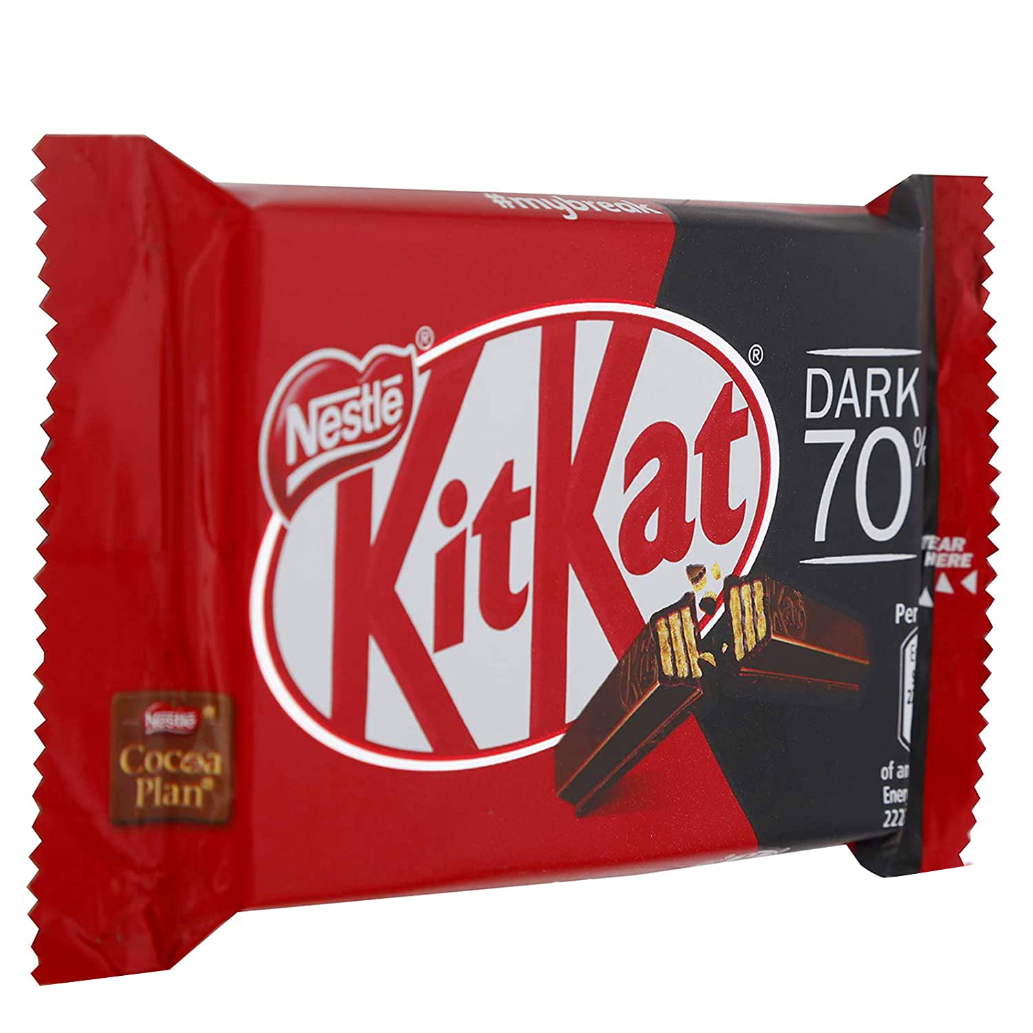 The Nestle dark KitKat chocolate bar consists of crispy wafer covered in smooth 70% dark chocolate
