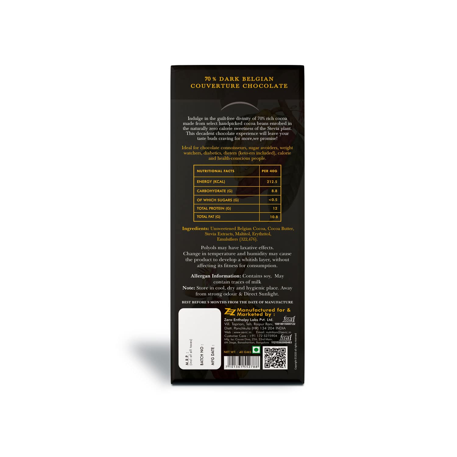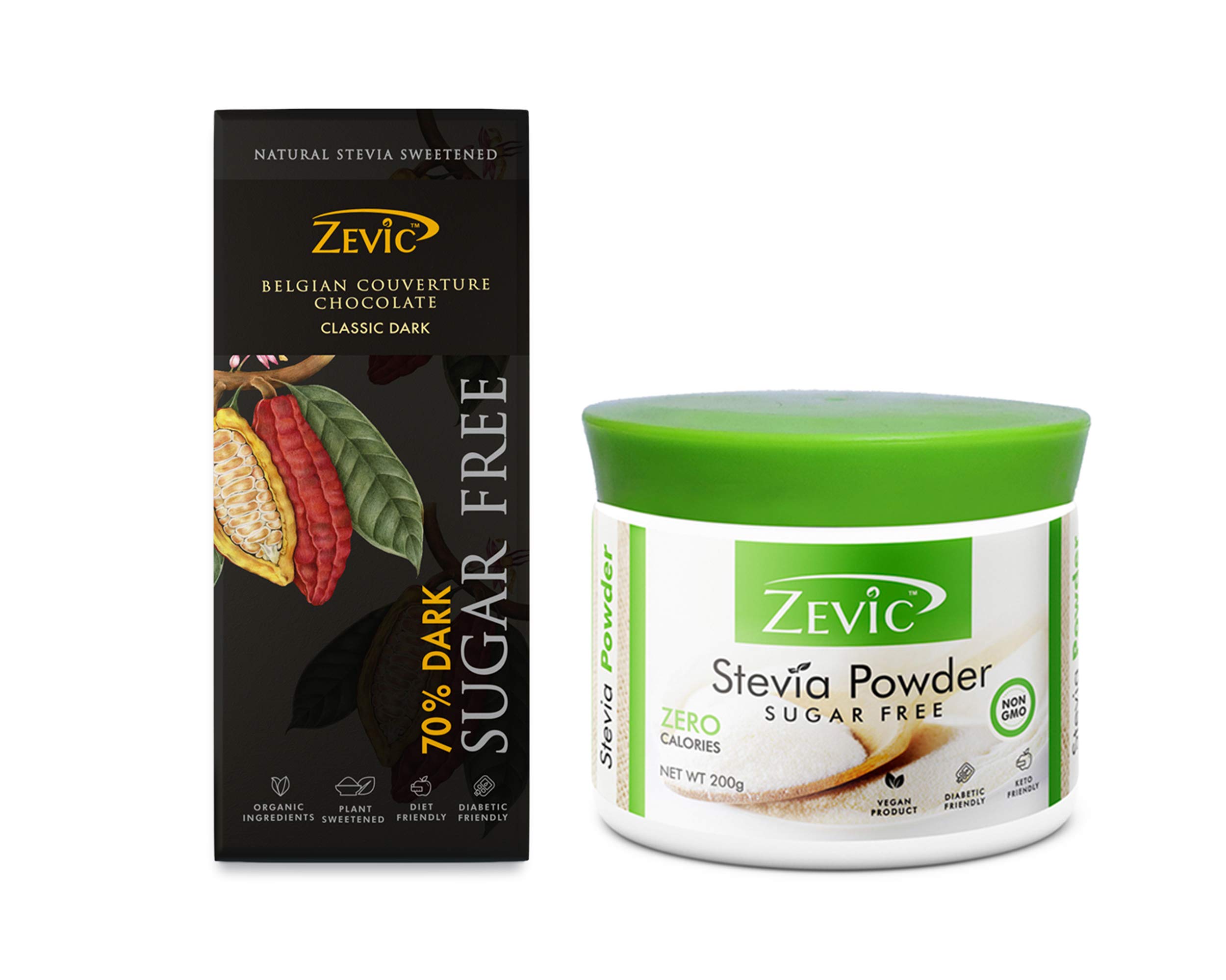 ZEVIC Stevia Sugarfree Powder 200gm + 70% Dark Belgian Chocolate with Stevia 40 gm Combo