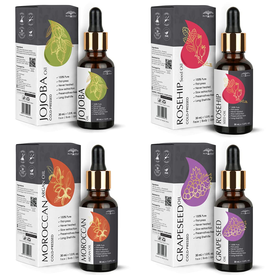 PACKAGE CONTENTS: All Naturals Rosehip Seed Oil 30ml All Naturals Jojoba Oil 30ml All Naturals Moroccan Argan Oil 30ml All Naturals Grapeseed Oil 30ml All Naturals Apricot Oil 30ml
