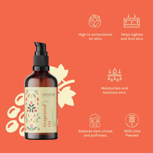 Tattvalogy Organic Grapeseed Oil | Cold Pressed Grapeseed Oil | For Face & Body | Eliminates Wrinkles, Scares, Acne, Blemishes, Dry & Oily Patches | Rich Essential Nutrients & Vitamins (50ml)