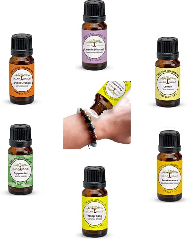 All Naturals Aromatherapy Bracelet Combo Unique Diwali Gift Set of 6 Essential Oils (Sweet Orange, Lavender Himachal, Lemon, Peppermint, Ylang Ylang & Frankincense) 100% Pure & Undiluted - 15 ML Each (Combo 3)