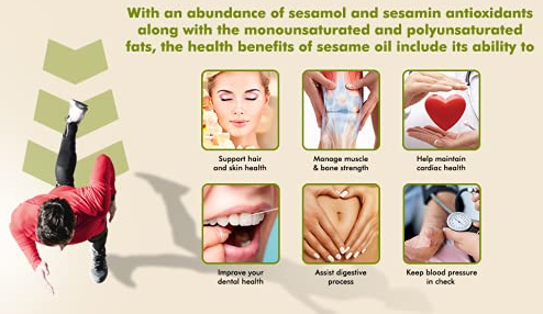 The health benefits of sesame oil include its ability to improve hair and skin health
