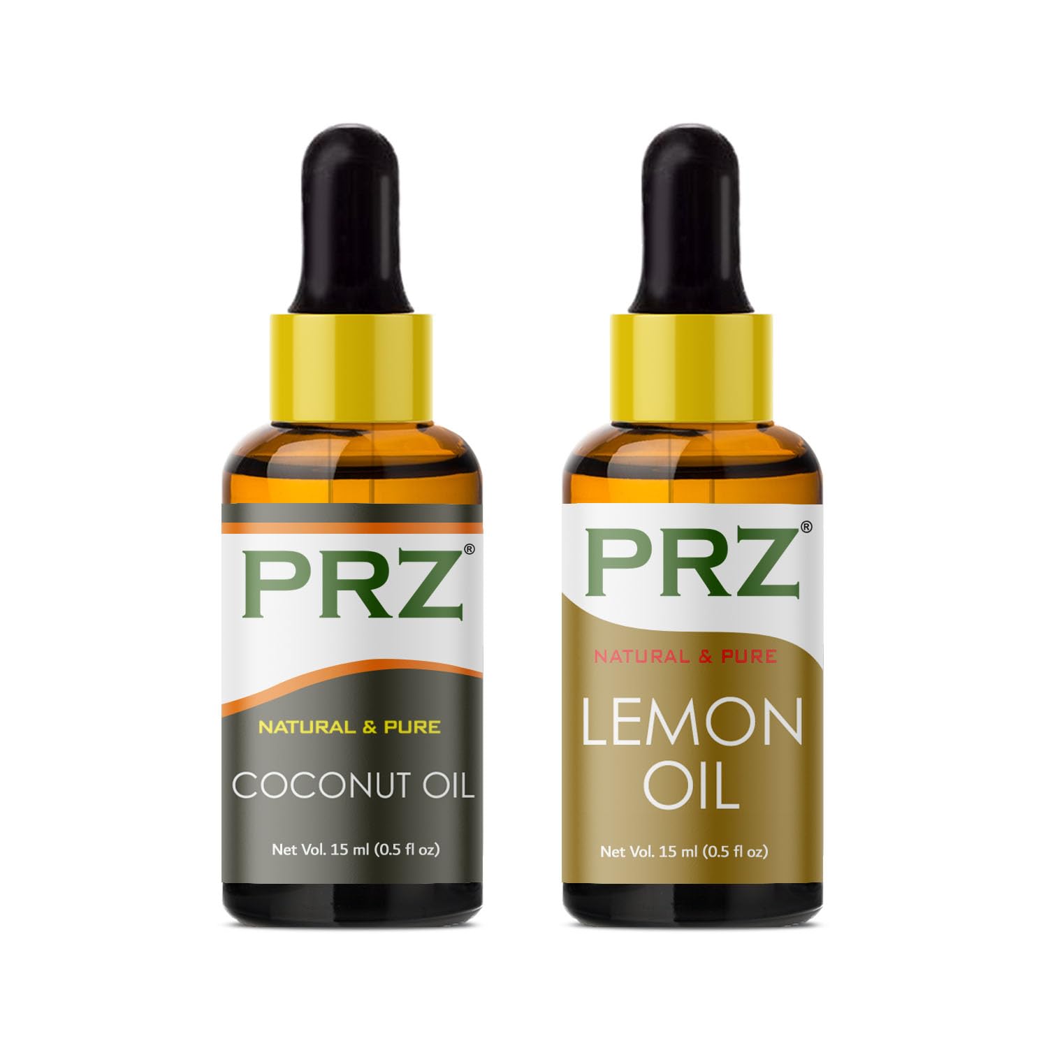 PRZ Combo of Cold Pressed Coconut Oil Olive Carrier Oil & Lemon Essential Oil 100% Pure Natural & Therapeutic Grade Oil for Aromatherapy Body Massage Skin Care & Hair Growth (15ML Each)