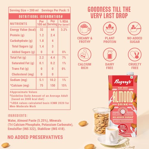 High in calcium: Each serving of Bagrrys Almond Drink provides 15% of your daily calcium requirement. Calcium is essential for maintaining strong bones and teeth making this beverage a nutritious choice.