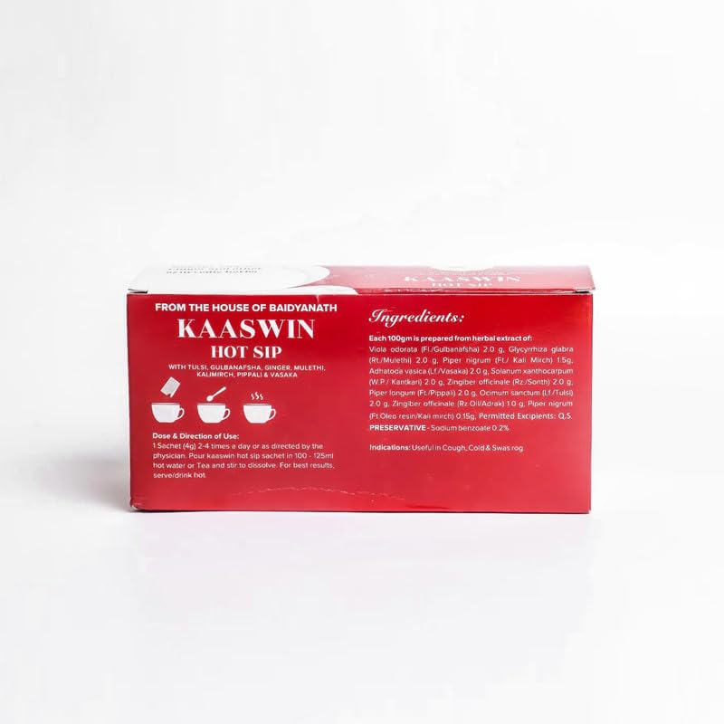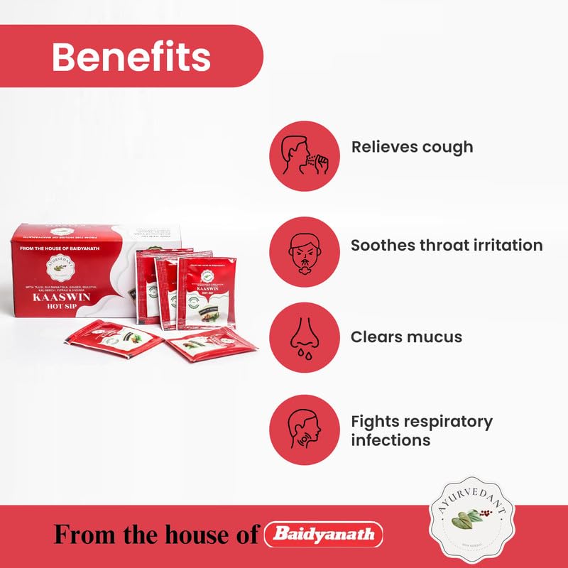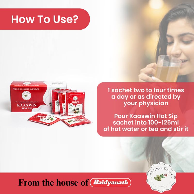 Potent Ayurvedic Formula: Experience the strength of Baidyanath's Ayurvedant Kaaswin Hot Sip a herbal blend crafted to provide effective relief for both wet and dry cough cold allergic cough throat irritation congestion and respiratory illnesses.
