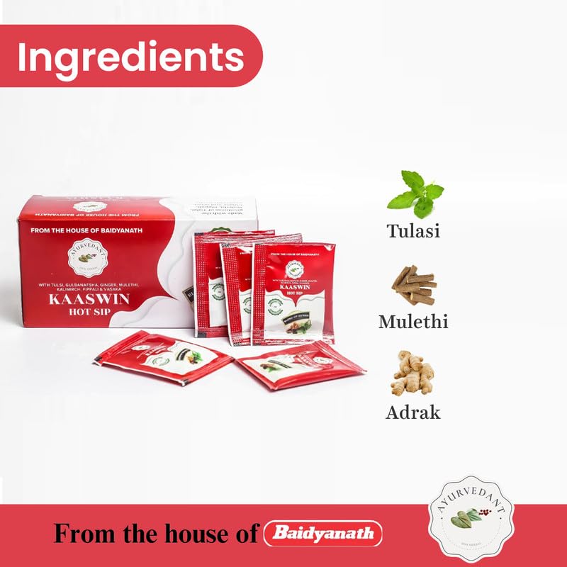 Holistic Well-being: Embrace natural comfort with Ayurvedant Kaaswin Hot Sip Tea carefully formulated with herbs known for their soothing properties. Perfect for maintaining overall health during cough and cold seasons.