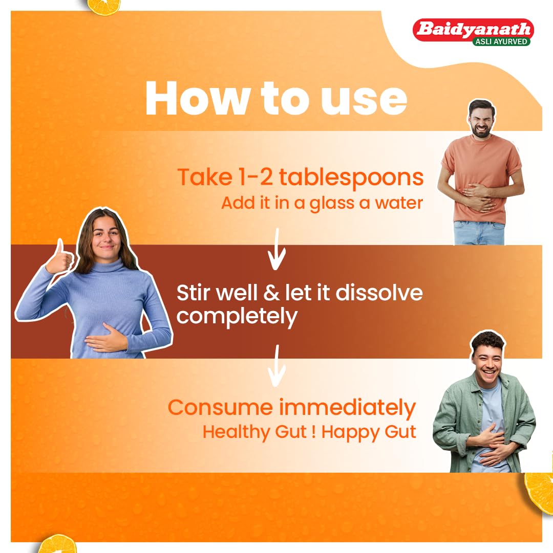Baidyanath Isabgol Orange Lax is a bulk-forming laxative that provides gentle constipation relief. It is made with premium psyllium husk that helps soften stool and promotes bowel regularity. This gluten-free formula comes in a refreshing orange flavor an