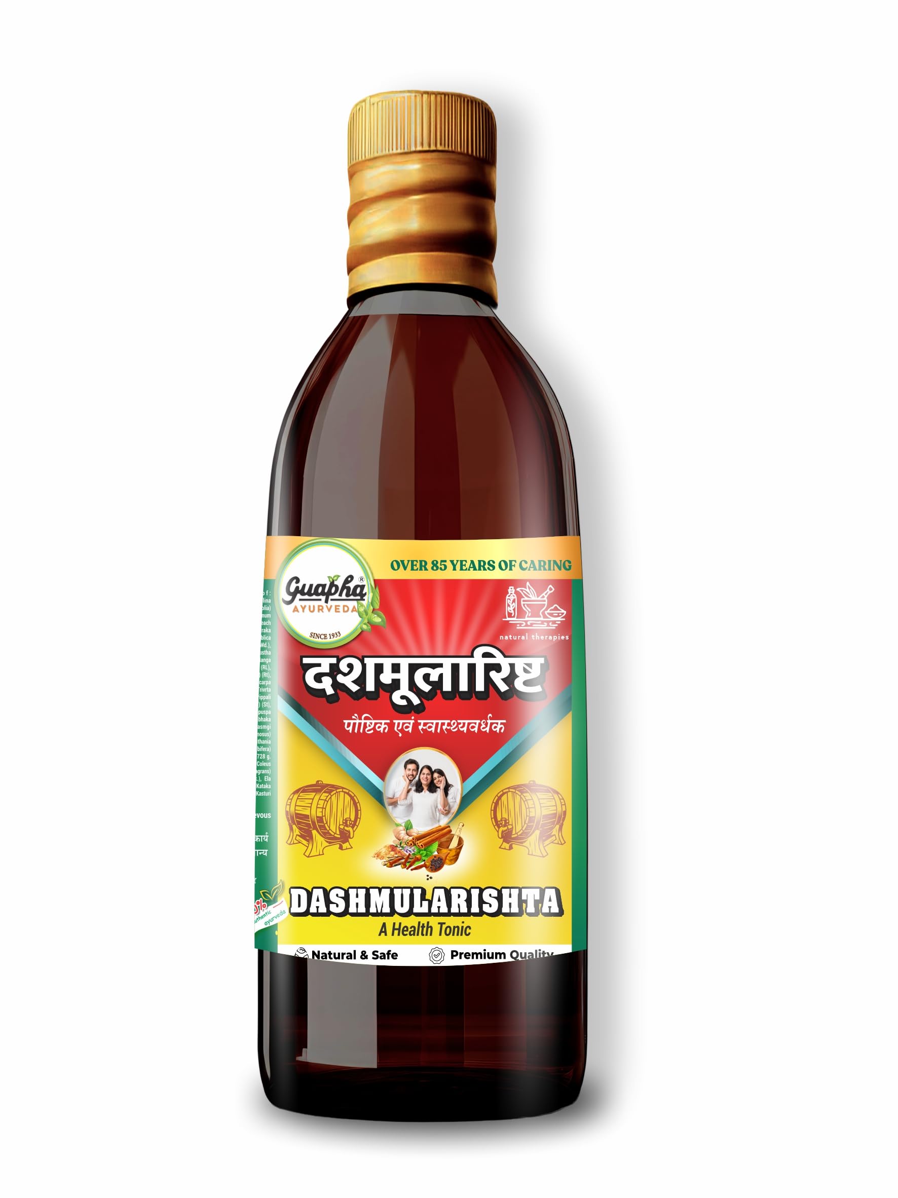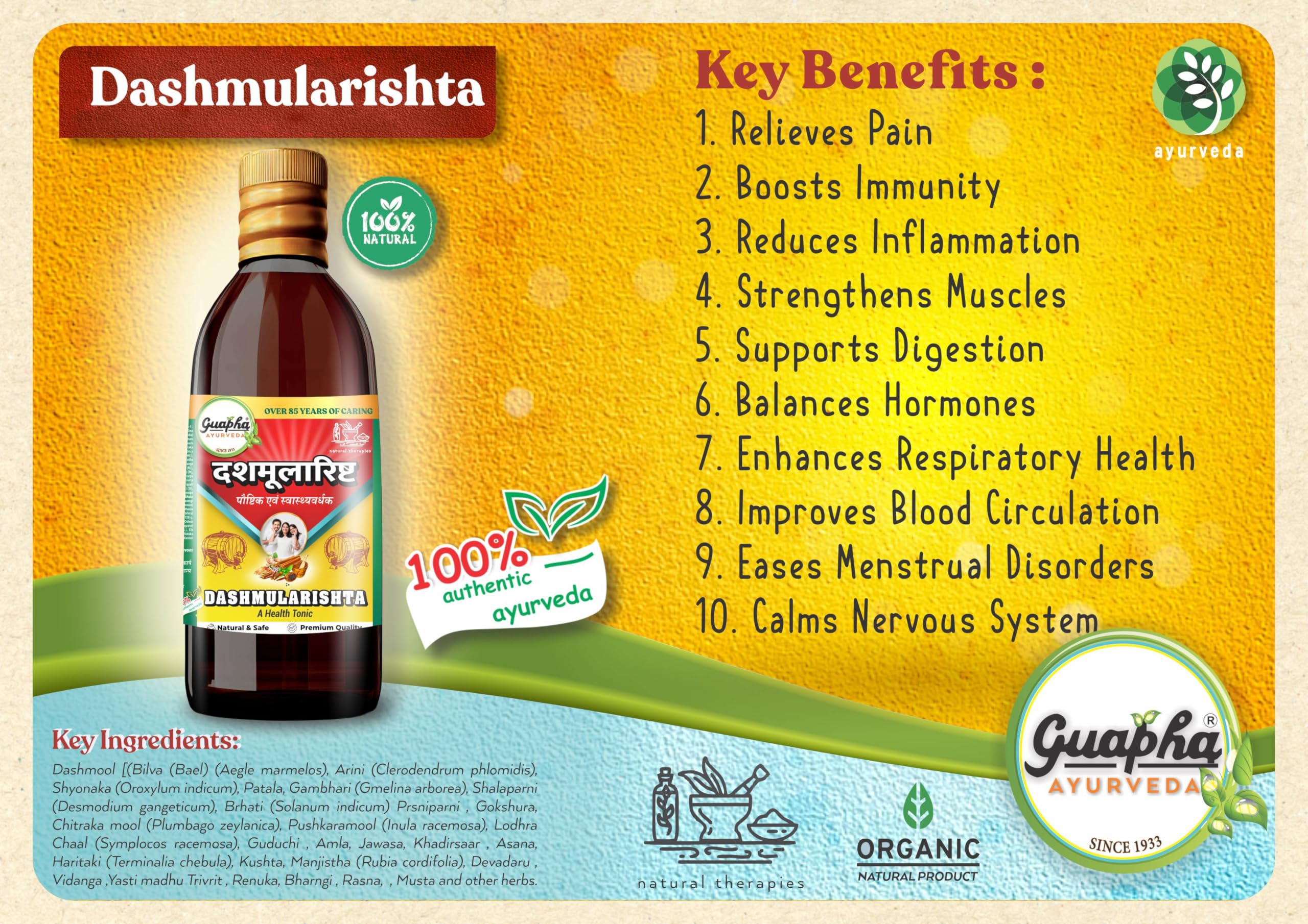Guapha Ayurveda Dashmularishta is crafted with ten powerful herbs including Dashmoola to provide comprehensive support for postpartum recovery aiding in rejuvenation and strength.