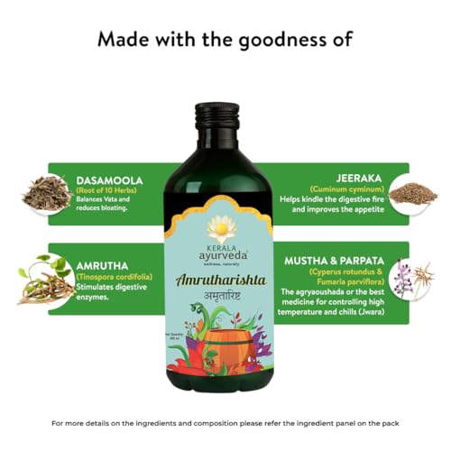 Relieves high temperature cold and body ache- Amrutharishta helps to bring down the high temperature and eases cold. It also helps in amapachana or metabolizing accumulated toxins.