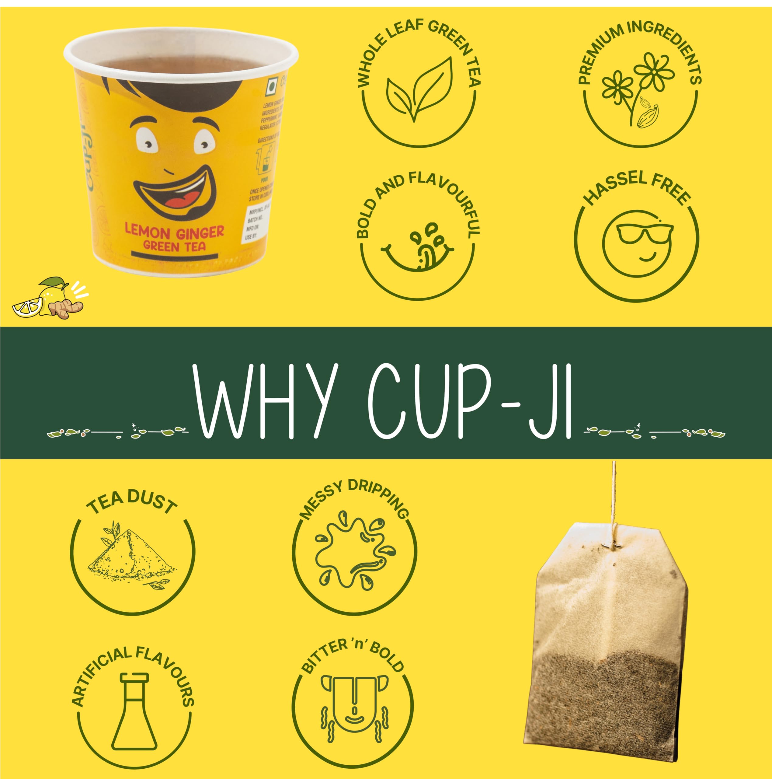 Delight in the invigorating blend of Cup-Ji Lemon Ginger & Chatkara Green Tea expertly formulated to boost metabolism and support weight loss infused with the zesty flavors of lemon ginger and mint.