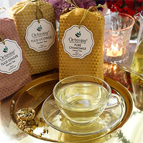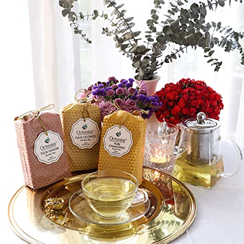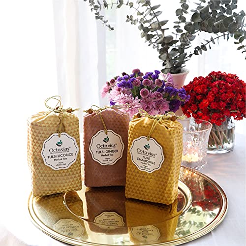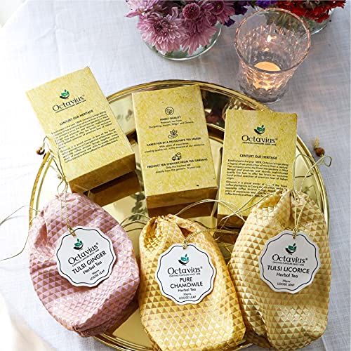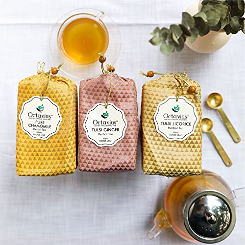 Octavius Assortment of Healthy Caffine Free Whole Leaf Tisane Teas| 3 Premium Loose Leaf Tisane| Tulsi Ginger| Tulsi Rose Chamomile | Tulsi Licorice - 30 GMS Each in Handcrafted Festive Pouches