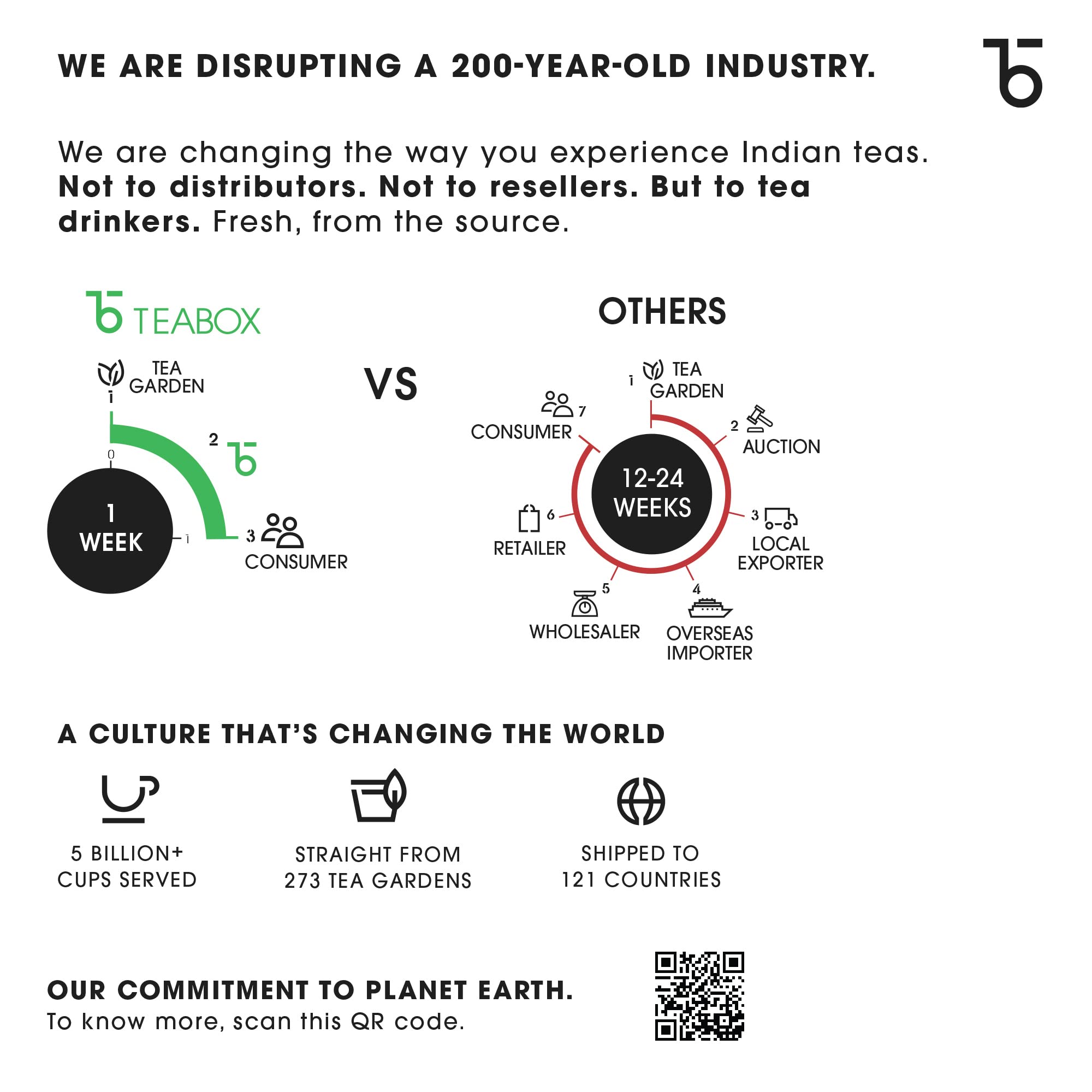 ABOUT TEABOX Disrupting a 200 year old industry Teabox connects tea to people directly from the foothills of the Himalayas. We source fresh Indian tea and have served over 5 Billion cups to 121 countries.