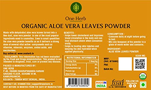 One Herb Organic Aloe Vera Leaves Powder 100g for Skin Care Lowers Cholesterol and Relieves Arthirit