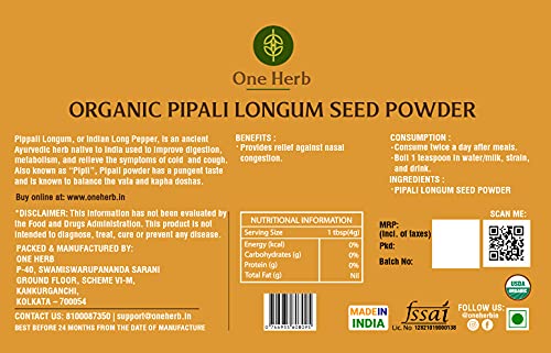 One Herb - Organic Pipalli Longum Powder 100g (Indian Long Pepper) for Digestion, Relieves Nasal Congestion, Alleviates PMS Cramps