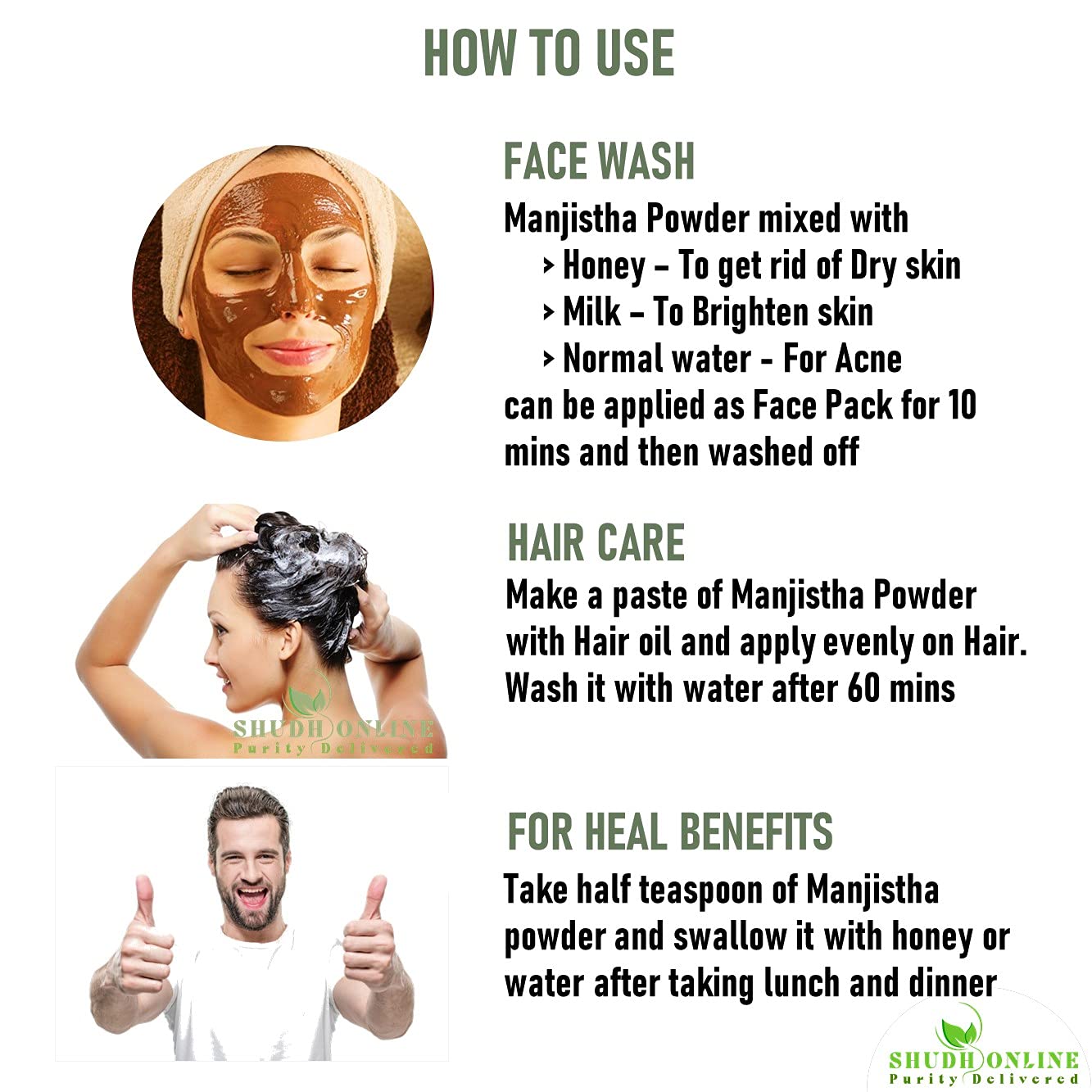 HOW TO USE - Majith powder mixed with Honey can be applied on the face for 15 minutes and can be washed off (or) Take half teaspoon of Manjistha powder and swallow it with honey or water after taking lunch and dinner