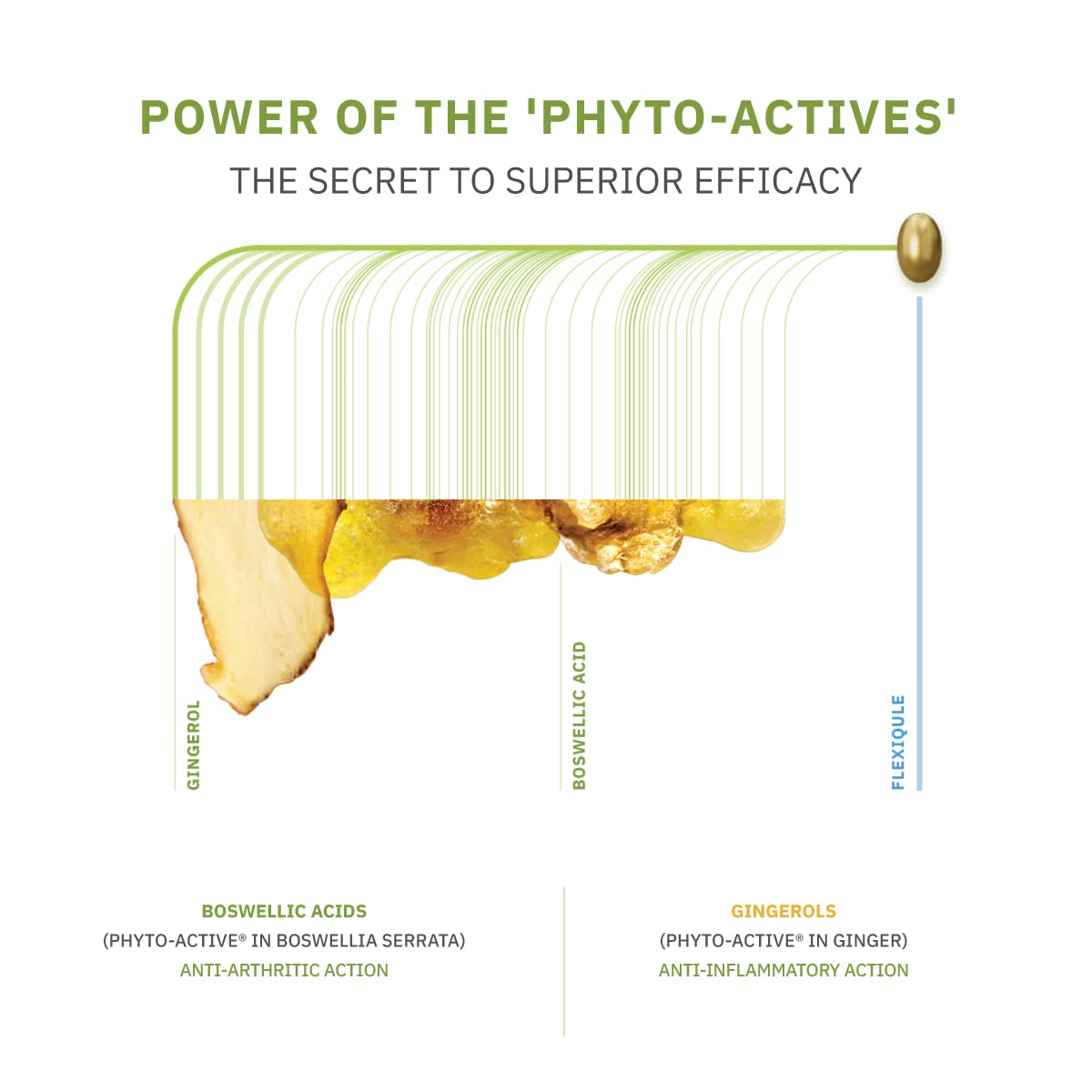 Phyto-Actives' HIGH POTENCY Plant Extracts - The Key to Unmatched Efficacy: FlexiQule a Phytoceutical solution that is a combination of the powerful âPhyto-activesâ of Boswellia Serrata and Ginger which are extracted and synergized using proprietary P