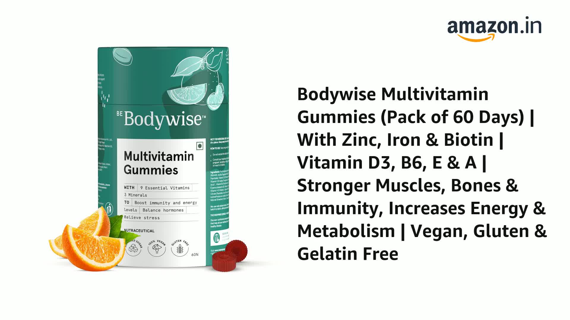 Be Bodywise Multivitamin Gummies|With Fibre, Zinc, Iron & Biotin|Vitamin D3, B6, E & A|Boosts Energy & Stamina, Improves Immunity & Skin Health|Vegan, Gluten & Gelatin Free, 1 count, 60 Servings
