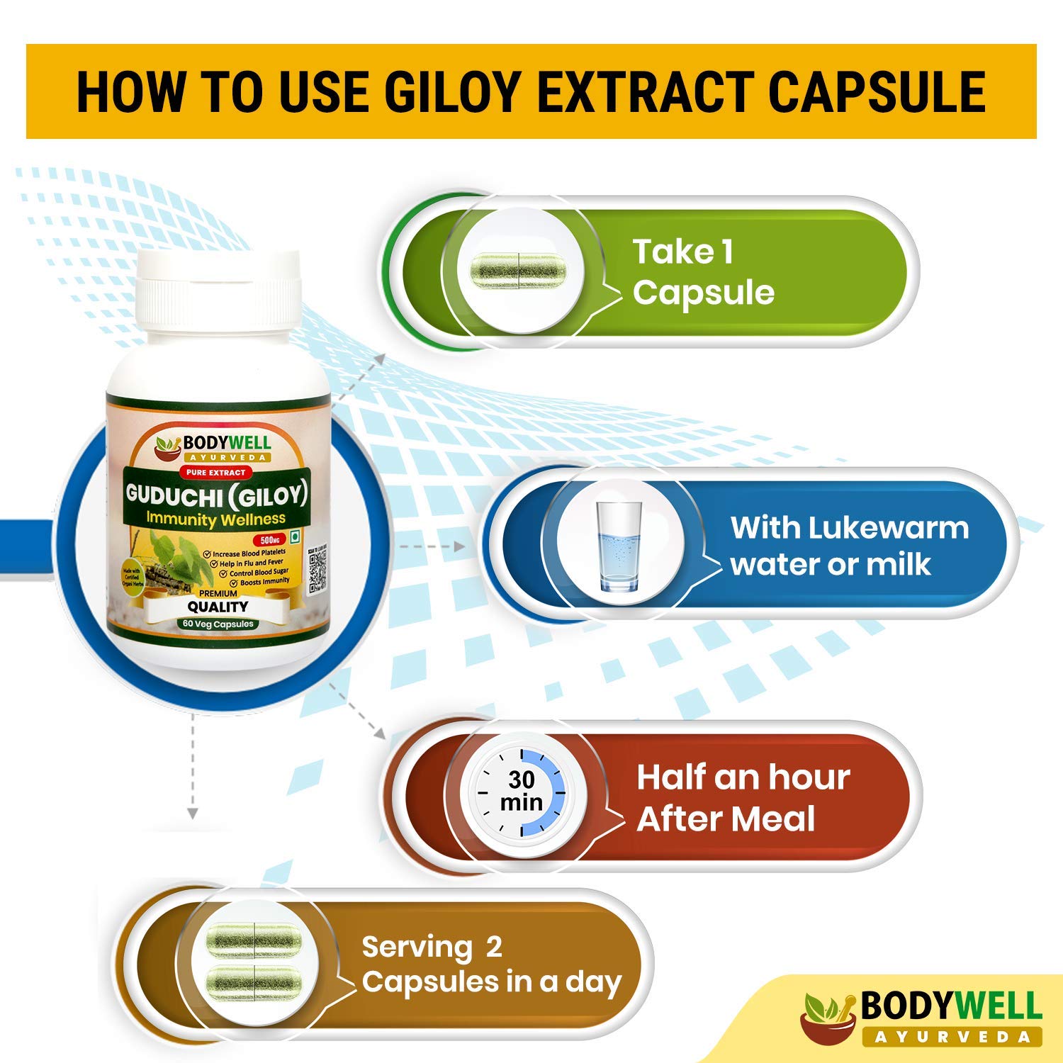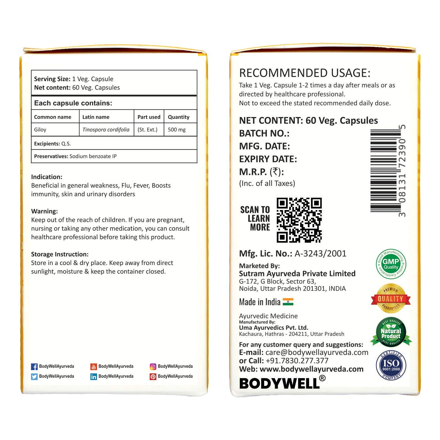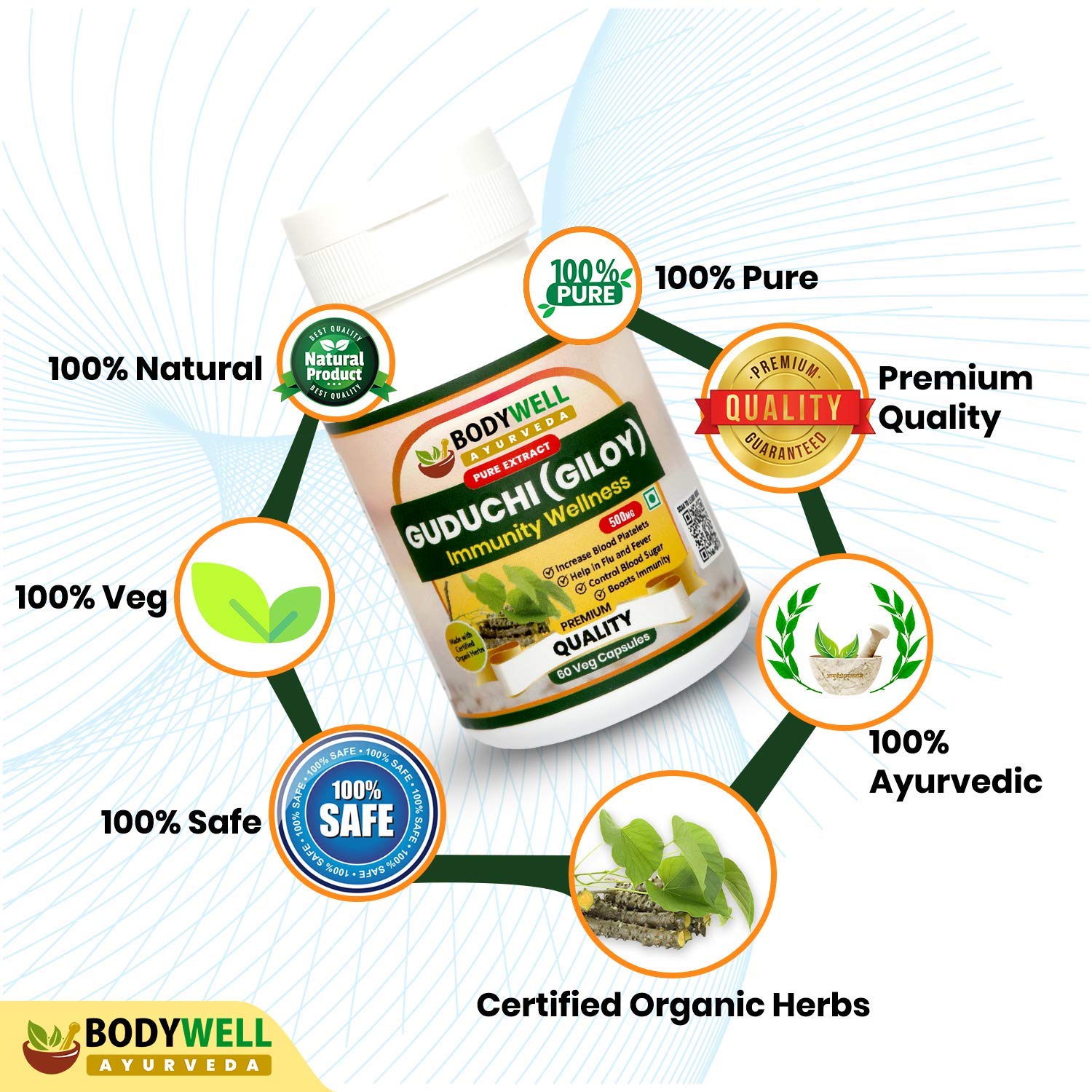 PREMIUM SAFE AND NATURAL GILOY (GUDUCHI) Caps..: BodyWell Giloy (Guduchi) extract Caps.. contains the natural Giloy extract and carefully manufactured in a GMP certified manufacturing facility. Absolutely safe to use.