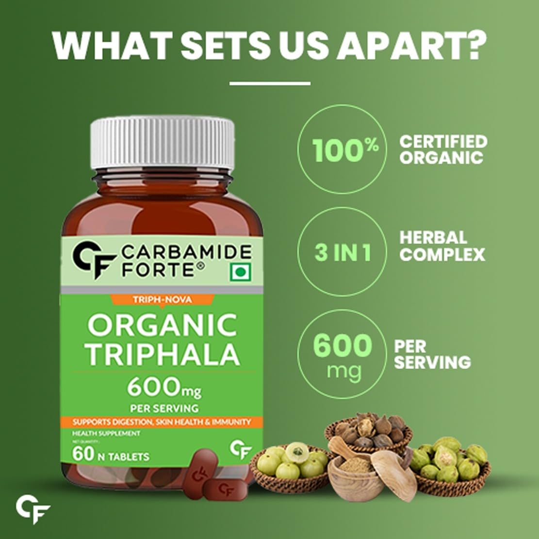 Carbamide Forte Organic Triphala Powder Tablets | 100% Natural 600mg Triphala Churna Powder Organic Tablets support Healthy Digestion Improve Gut Health & Relieve Constipation | Triphala Tablets for eyeshair liver | 60 Tablets