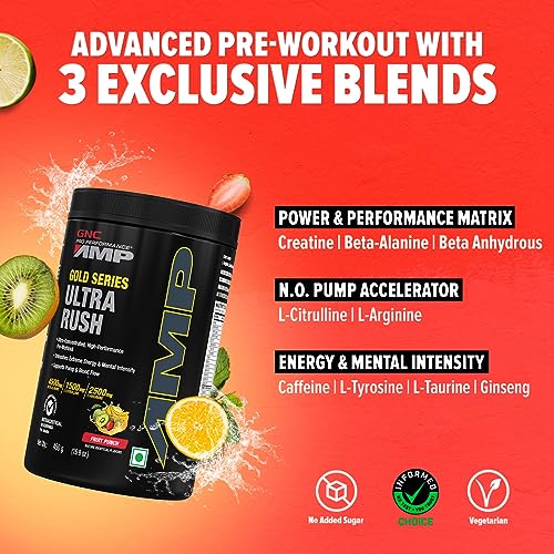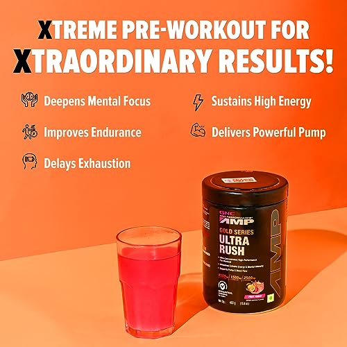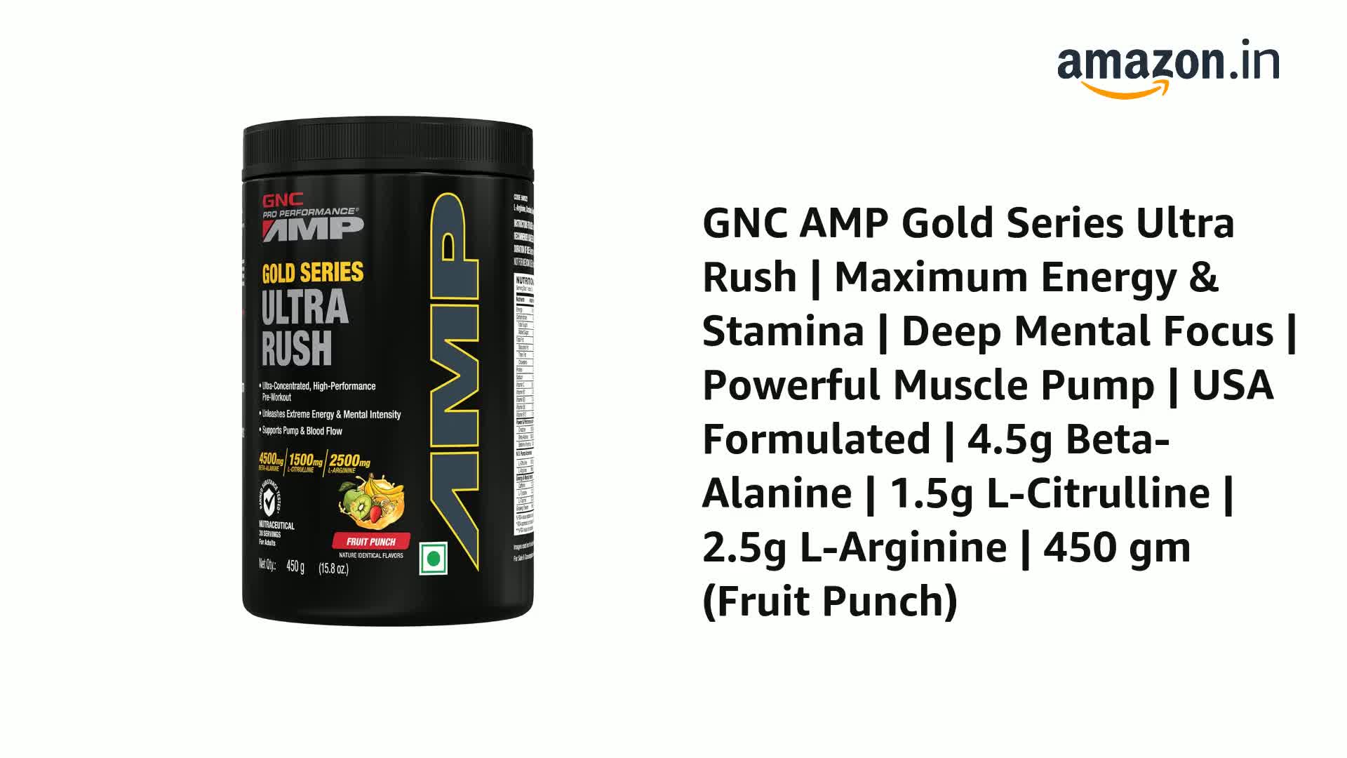 GNC AMP Gold Series Ultra Rush Pre-Workout | 450 gm | 30 Servings | Maximum Energy & Stamina | Deep Mental Focus | Powerful Muscle Pump | 4.5g Beta-Alanine | 1.5g L-Citrulline | 2.5g L-Arginine | Fruit Punch