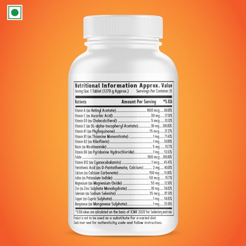 19 VITAMINS & MINERALS IN ONE TABLET: This highlights the comprehensive nature of the multivitamin encapsulating a wide array of essential nutrients including various vitamins and minerals in a single tablet. These nutrients play important roles in variou