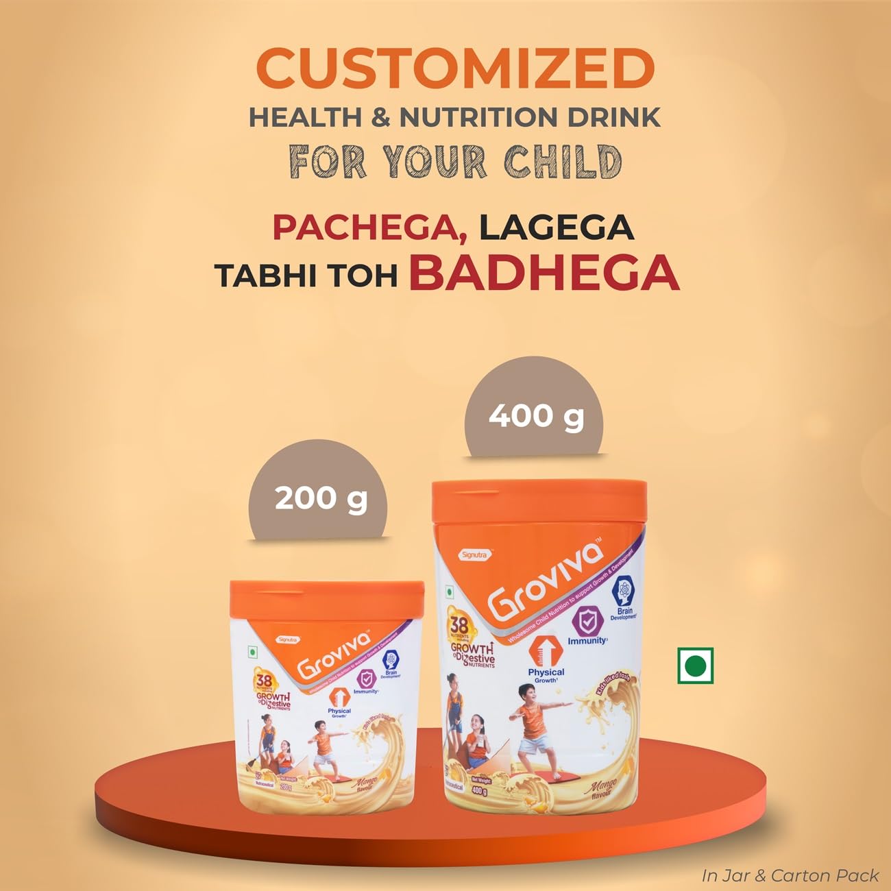 Groviva Customized Health & Nutrition Drink for Kids - Supports Digestion Physical Growth Immunity & Brain Development - Mango Flavour 400g (Jar)