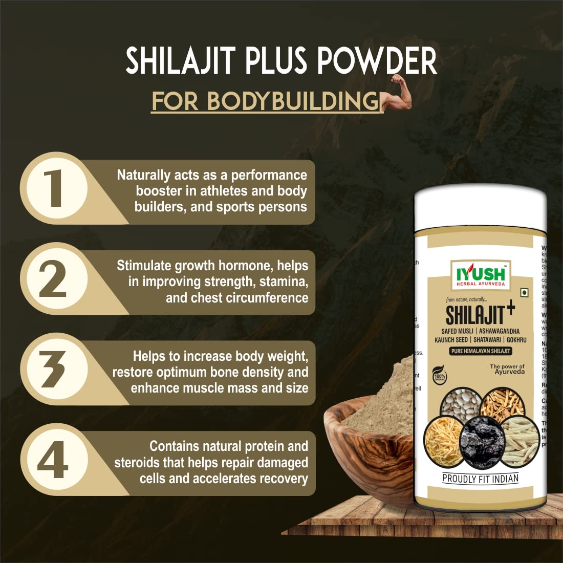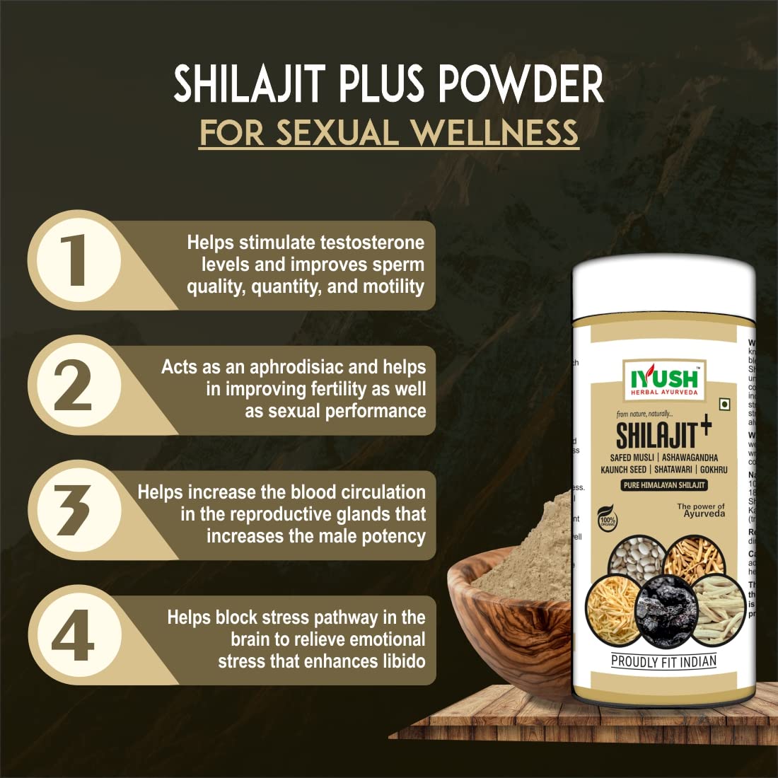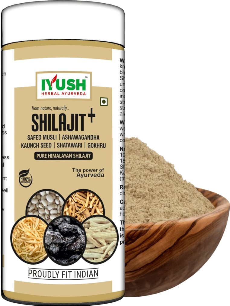 HomeHealth & PersonalDiet & NutritionHealth SupplementsIYUSH Herbal Ayurveda Pure Shilajit Original Powder with Ashwagandha Safed Musli Satavar Gokshura Kaunch Beej | Shilajeet Original | Silajit Original Himalayan | Energy Booster for Men & Women | 100gm