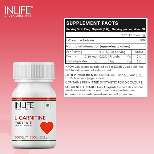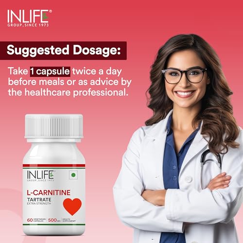 INLIFE L-Carnitine L-Tartrate Capsules 1000mg | Supports Muscle Health & Excercise Recovery | Supplement for Men Women - 60 Vegetarian Capsules (Pack of 1, 60)