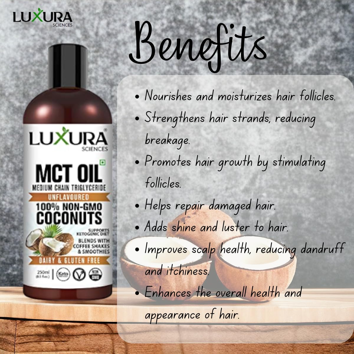 Premium Grade A Quality: Made from the finest organic coconuts Luxura Sciences MCT Oil guarantees top-notch quality and purity ensuring maximum effectiveness and benefits.