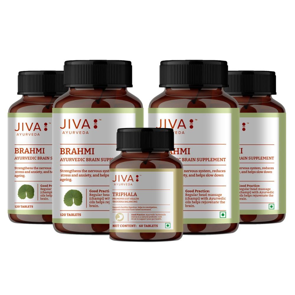 Jiva Brahmi - 120 * 4 Tablets For Mind Wellness With Triphala 60 Tablets Free | Helps to Relief Stress & Anxiety | 100% Pure & Natural